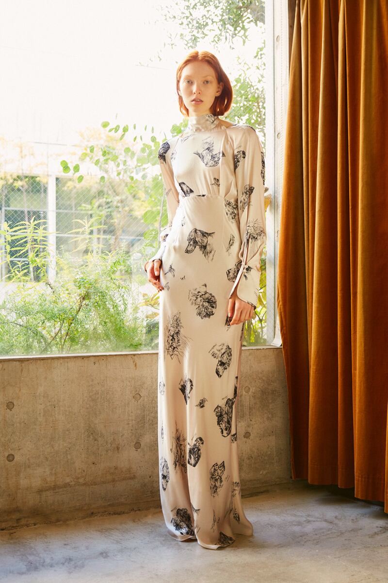 上質なSILK100%のシルクサテン素材を贅沢に使用した「chien silk satin dress」は、身体に心地よく馴染んくれるバイヤス仕立てです。独自の砂洗い加工により、柔らかく、軽やかな着心地を実現しています。また、犬柄が施されているオリジナルプリントは、狩猟犬がモチーフとなっており、ウサギや鳥も登場する、他にはないユニークなデザインが魅力です。