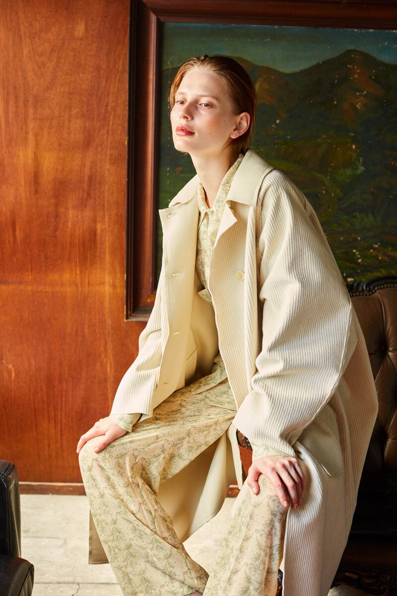 メタル釦がアクセントとなり、取外し可能なサッシュベルトでスタイルを調整することで、様々なコーディネートを楽しむことができます。
